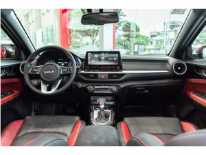 Cabin xe KIA K3 1.6 Turbo GT sử dụng tông đen sang trọng với điểm nhấn là các viền chỉ đỏ nổi bật. Hàng ghế trước có logo GT màu đỏ được thêu nổi trên lưng ghế, thiết kế vô lăng D-cut thể thao, ốp bàn đạp kim loại sáng bóng, chụp cần số thêu chỉ đỏ là những điểm nhấn tạo nên dấu ấn giúp phân biệt với các phiên bản trước.